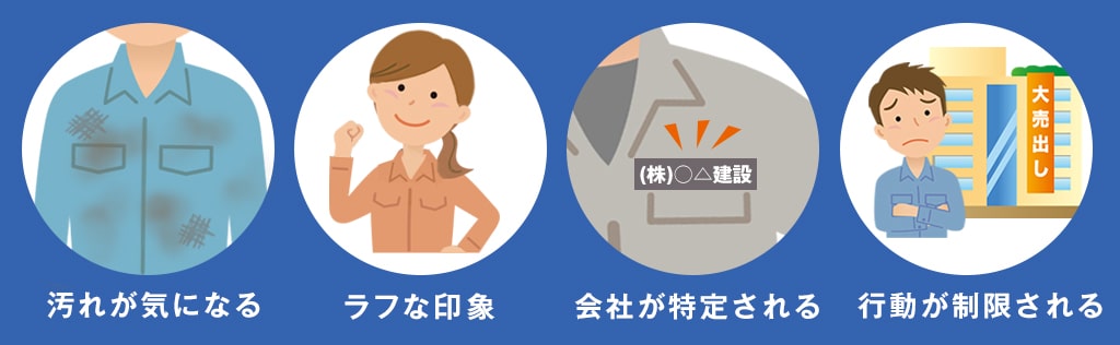 作業着が制服として会社貸与されている場合、作業着についている社名やマークから、自分が勤務している会社が特定されるケースがあります。通勤中の事故やトラブルに巻き込まれ、会社にクレームが寄せられたり、会社のイメージダウンにつながったりする危険性もあるでしょう。